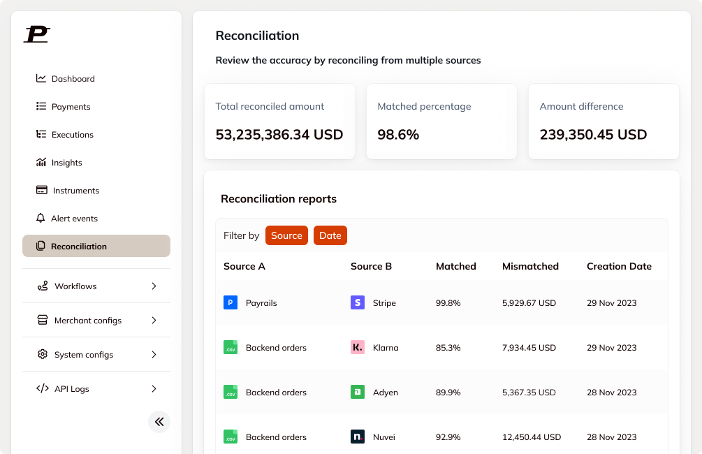 Match transactions across PSPs, banks, and accounting systems automatically. Eliminate manual reconciliation work and close your books faster with real-time accuracy.